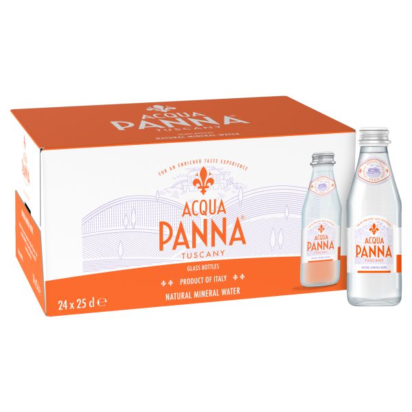 100% natural mineral water from the Panna source in Italy. The 250 ml glass bottle with screw cap is just the right amount of refreshment alongside a light meal, and the perfect format for parties and friendly gatherings.