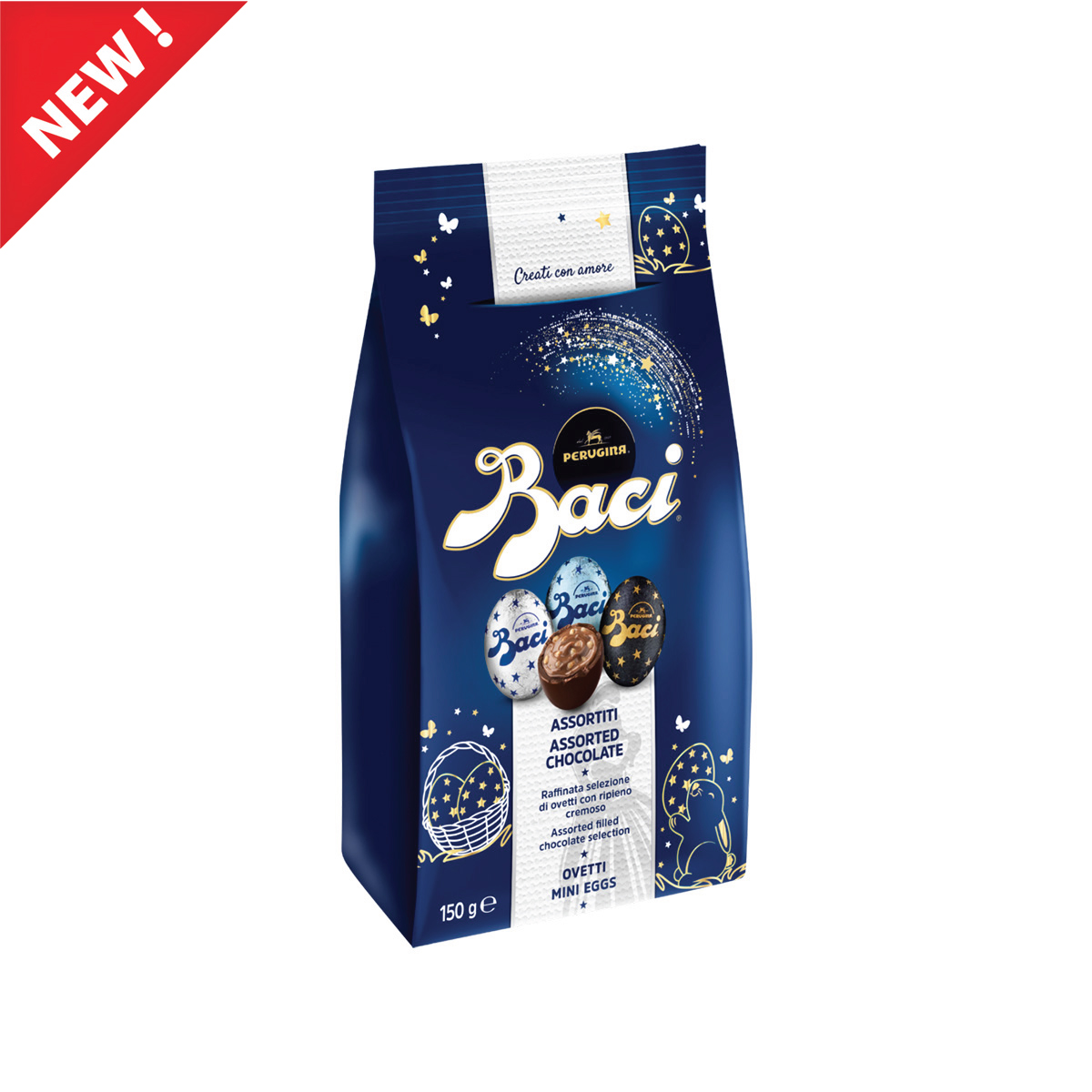 Crafted with love in Italy since 1922, Baci® Mini Eggs Assorted 150g. The bag contains lots of eggs in the Original Dark, Milk and Extra Dark 70% flavours, each with a creamy filling and crunchy coating of chopped hazelnuts. A gift that will make every chocolate-lover happy!